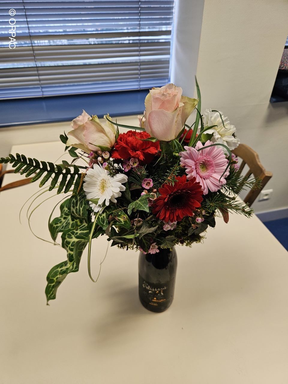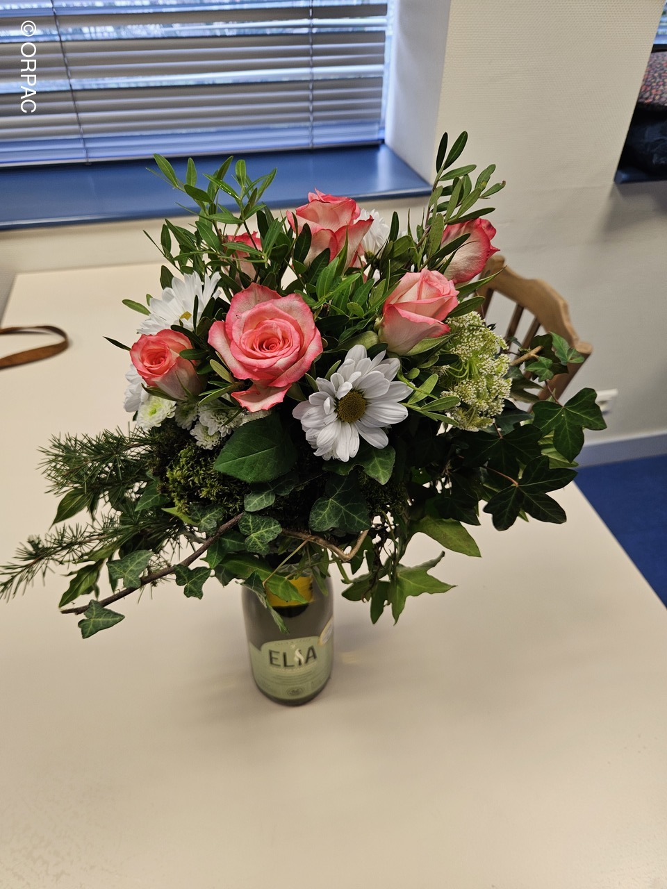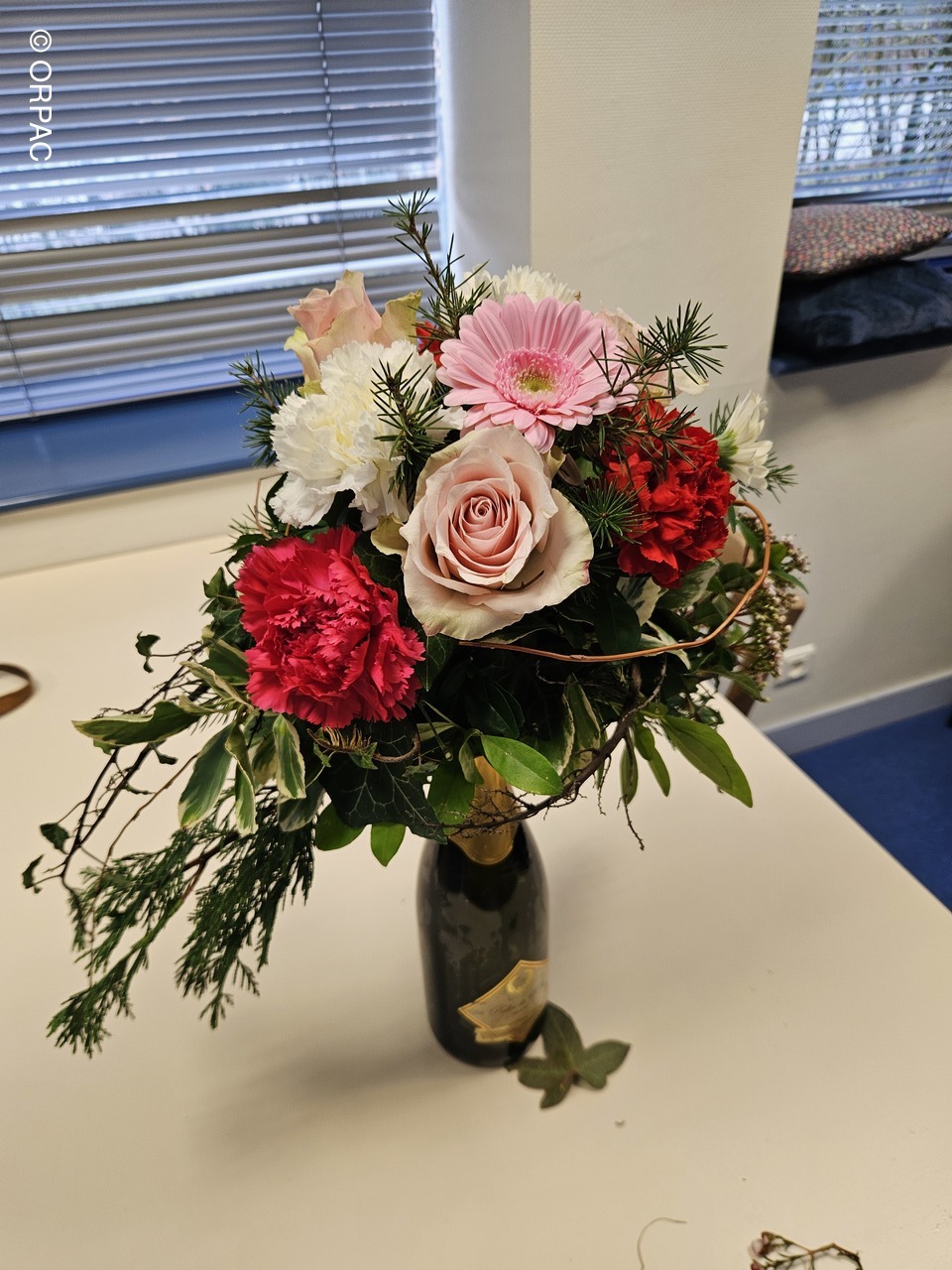 Nos adhérentes ont créé une composition (centre de table) sur une bouteille...Joli présent