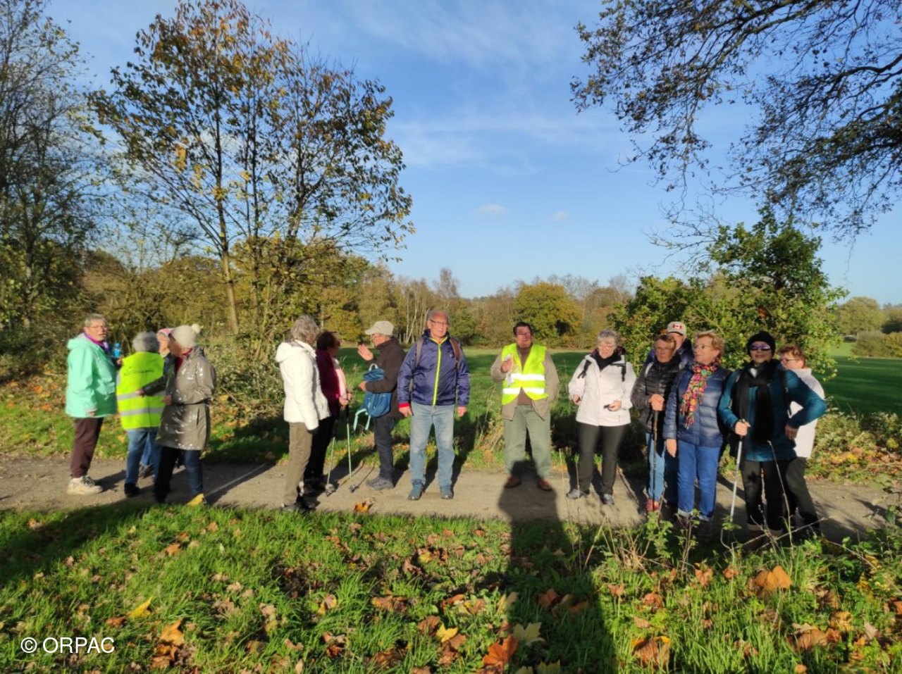 16 randonneurs sur le site de Bain de Bretagne, avec l'étang sous le soleil
